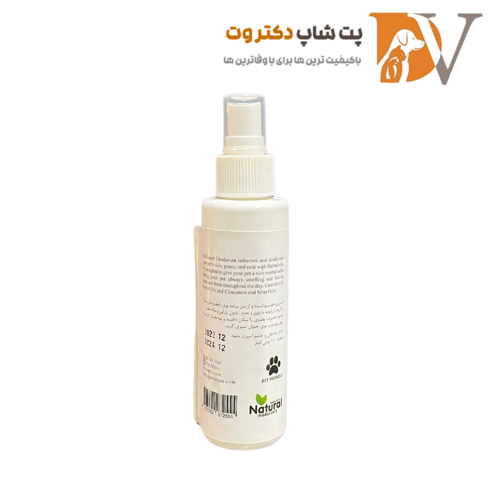 این محصول بدون الکل و بدون پارابن تولید میشود تا برای پوستهای حساس نیز قابل استفاده باشد و احتمال ایجاد حساسیت و خشکی پوست را به حداقل برساند. برای استفاده کافی است اسپری را با فاصله مناسب روی بدن حیوان (بهجز صورت، چشم، بینی و ناحیه تناسلی) بزنید و اجازه دهید روی موها بنشیند؛ در صورت نیاز میتوان موها را کمی برس کشید تا پخش یکنواختتری ایجاد شود. این اسپری گزینهای مناسب برای صاحبان حیواناتی است که نمیخواهند زیاد حمامشان کنند ولی میخواهند همیشه بوی خوب و قابلتحملی در خانه داشته باشند.