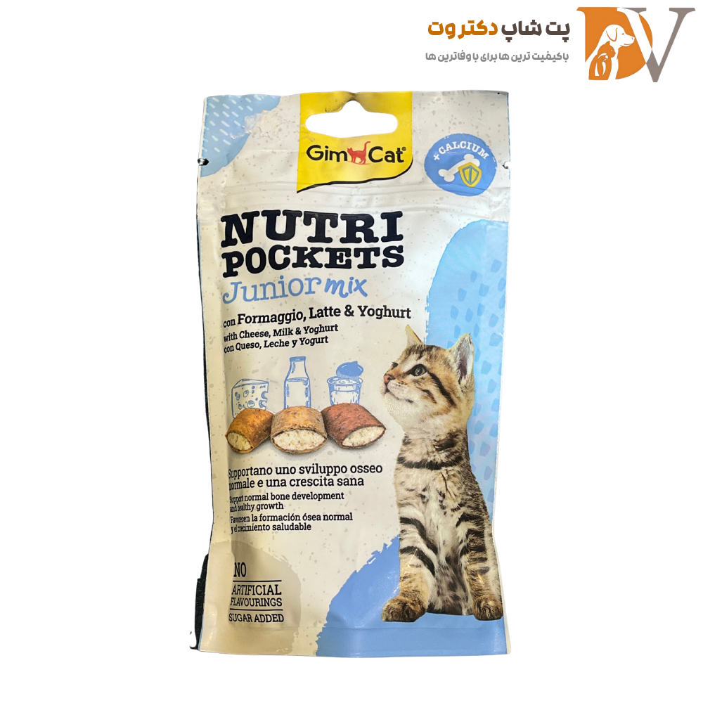 تشویقی بچه گربه جیم کت با طعم پنیر و ماست و شیر مدل نوتری پاکت GimCat Nutri Pocket Junior Mix
