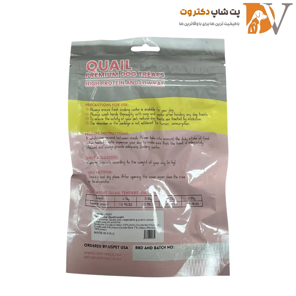 تشویقی سگ یو اس پت با طعم بلدرچین از گوشت تازه و باکیفیت بلدرچین تولید میشود تا سگها علاوه بر طعم عالی، از مواد مغذی طبیعی بهرهمند شوند. استفاده از گوشت تازه بلدرچین تأثیر بسیاری در جذابیت این تشویقی بلدرچین یو اس پت US pet داشته و آن را به انتخابی سالم و قابل اعتماد برای خانوادههای علاقمند به سلامت پت خود تبدیل کرده است.