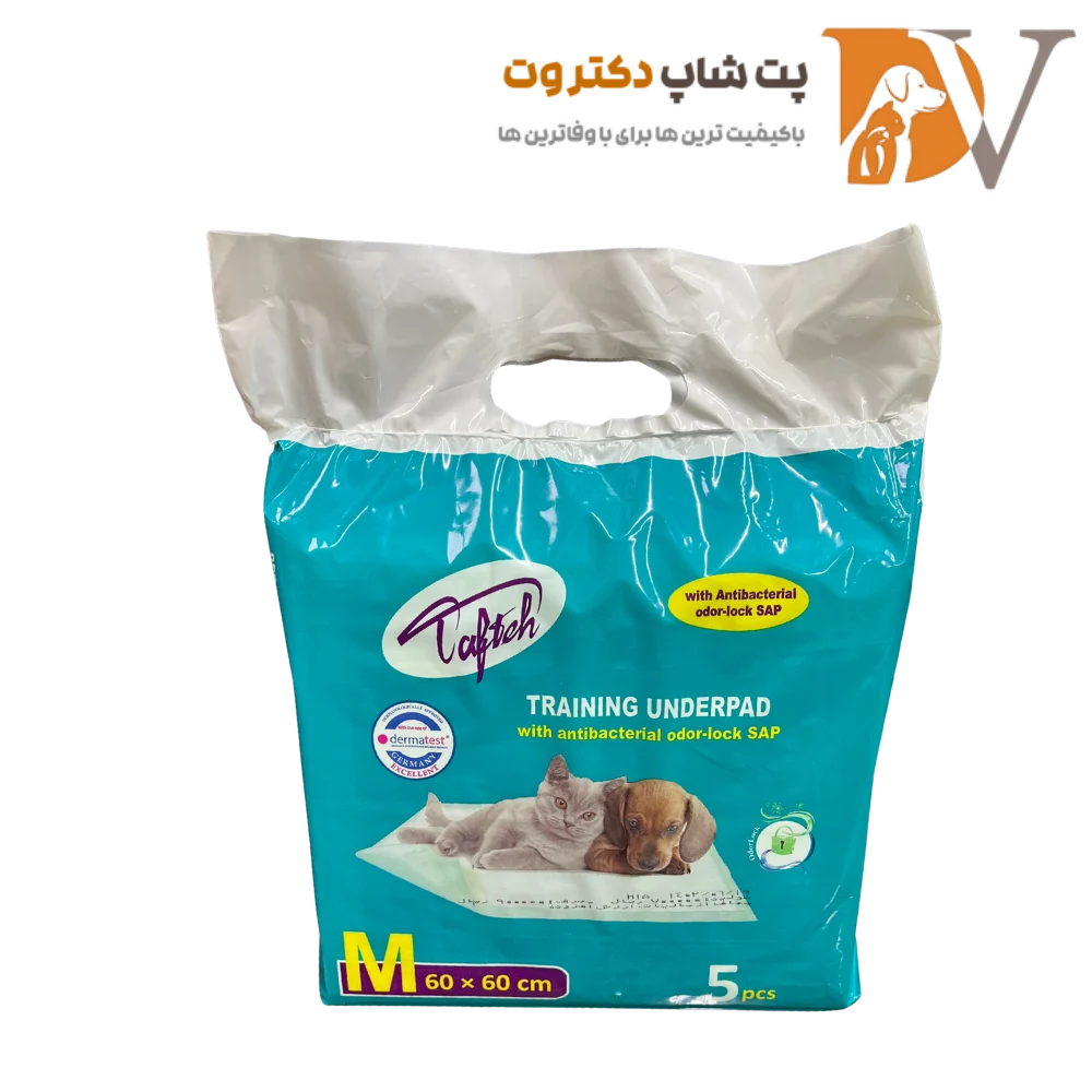 زیرانداز بهداشتی سگ و گربه برند تافته ابعاد ۶۰ در ۶۰سانتیمتر محصولی ضد حساسیت، آنتیباکتریال و با قدرت جذب بالا است که برای حیوانات خانگی کوچک مانند توله سگها و بچه گربهها مناسب میباشد. این پد از چند لایه تشکیل شده و شامل منسوج نبافته، خمیر کاغذ جاذب، پودر آنتیباکتریال و فیلم پلیاتیلن ضد نشت است که مانع از عبور رطوبت به سطح زیرین میشود. سطح آن نرم و لطیف بوده و از ایجاد التهاب یا حساسیت پوستی جلوگیری میکند. همچنین برای آموزش محل ادرار تولهها یا محافظت از محیط در زمان بیماری حیوان، گزینهای عالی محسوب میشود. بستهبندی معمولاً ۵ عددی است.