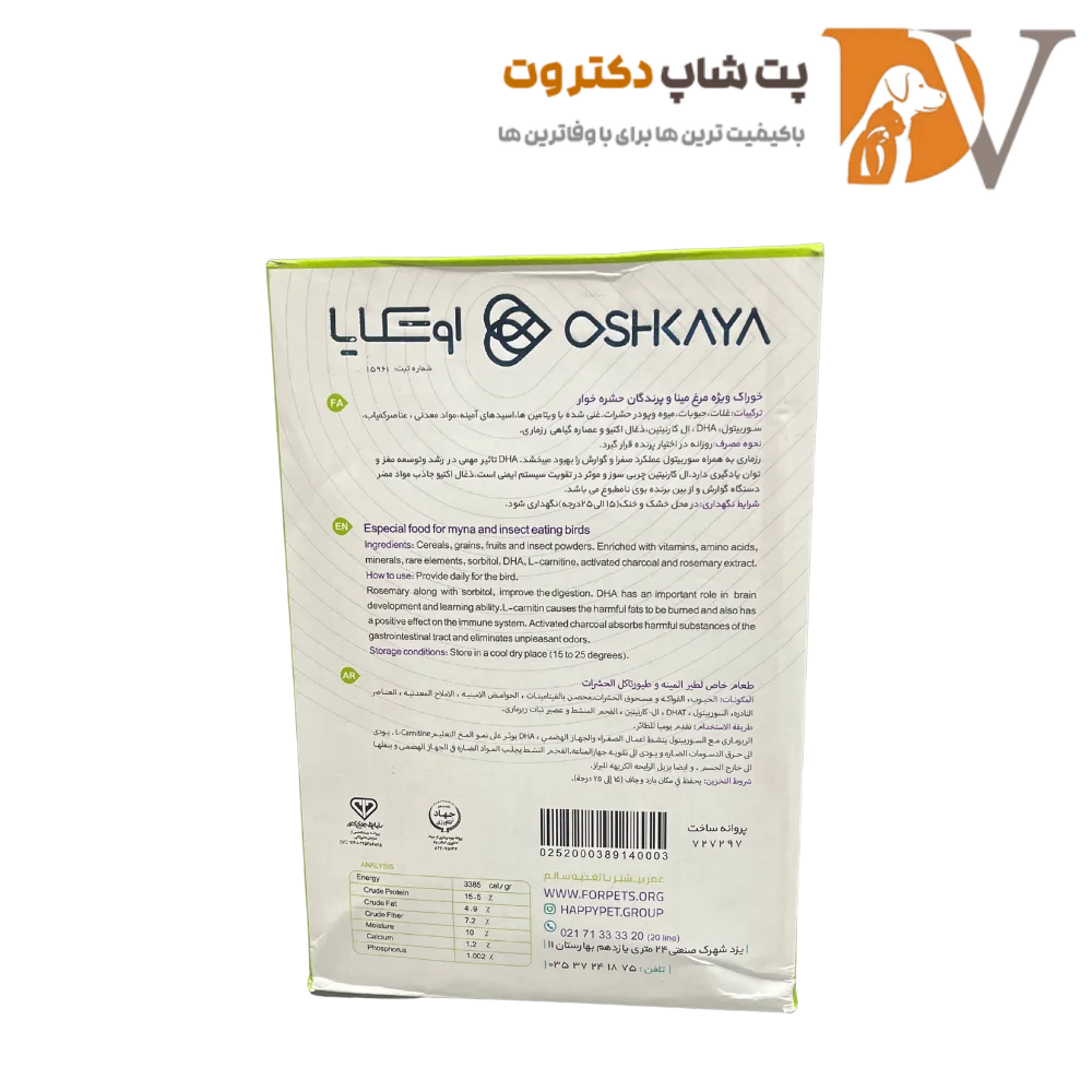غذای مرغ مینا اوشکایا مدل لارو حشرات وزن ۱ کیلوگرم، غذای پلتشده کامل و بالانسشده ساخت ایران است که مخصوص پرندگان حشرهخوار مانند مرغ مینا فرموله شده و حاوی لارو حشرات، میگو، عسل، ویتامینها، اسیدهای آمینه، مواد معدنی، عناصر کمیاب، DHA، ال-کارنیتین، زغال فعال و عصاره رزماری طبیعی عمل میکند؛ با آهن کنترلشده برای پیشگیری از کبد چرب و نقرس، پروتئین بالا و هضم آسان، سلامت، رشد و طول عمر پرنده را تضمین مینماید.