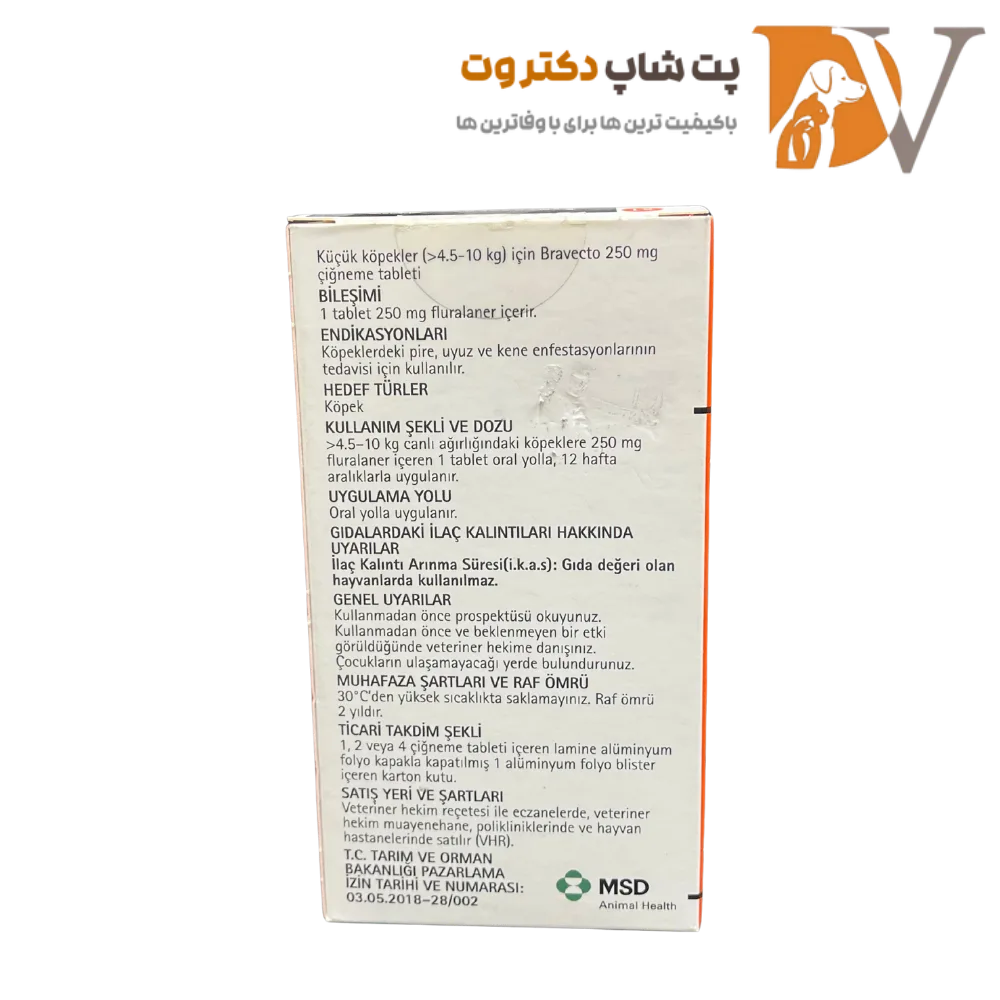 قرص ضد کک و کنه براوکتو مناسب سگ‌های نژاد ۴ تا ۱۰ کیلو Bravecto Flea And Tick Dogs، قرص جویدنی ۲۵۰ میلی‌گرمی حاوی فلورالانر است که کک‌ها را ظرف ۲ ساعت و کنه‌ها را ظرف ۱۲ ساعت از بین برده و تا ۱۲ هفته (۳ ماه) محافظت کامل فراهم می‌کند.​