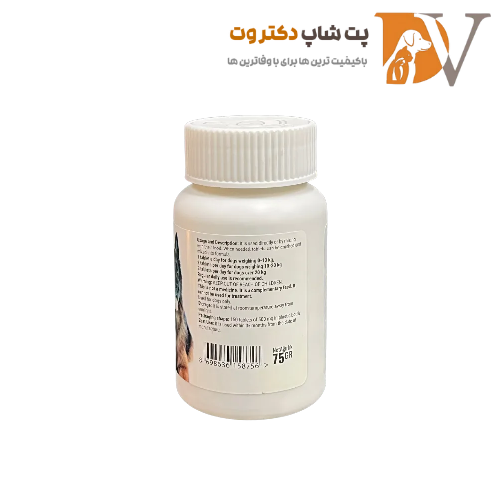 دوز مصرف روزانه بر اساس وزن: سگ ۱-۱۰ کیلو (۱ قرص)، ۱۰-۲۰ کیلو (۲ قرص)، بالای ۲۰ کیلو (۳ قرص) مستقیم یا مخلوط با غذا؛ اثر کامل پس از ۴-۶ هفته ظاهر میشود، در جای خشک و خنک نگهداری شود و در صورت آلرژی پوستی با دامپزشک مشورت گردد.