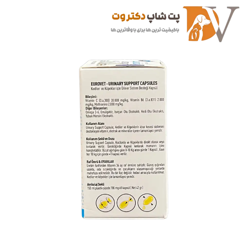 قرص مکمل بهبود مجاری ادراری حیوانات یورووت Eurovet Urinary Support بسته ۶۰ عددی، کپسول تخصصی ساخت ترکیه است که با ترکیب ویتامینهای B1، B2، B4، B12، اینوزیتول، اسید فولیک، امگا ۳ و ۶، عصاره گزنه، آستراگالوس و کوردیسپس، عملکرد کلیههای سگ و گربه را حمایت کرده و از آسیب اکسیداتیو، التهاب و نارسایی کلیوی جلوگیری میکند؛ مناسب تمام نژادها برای حفظ تعادل الکترولیتها، بهبود جریان خون کلیوی و تقویت سیستم ایمنی.