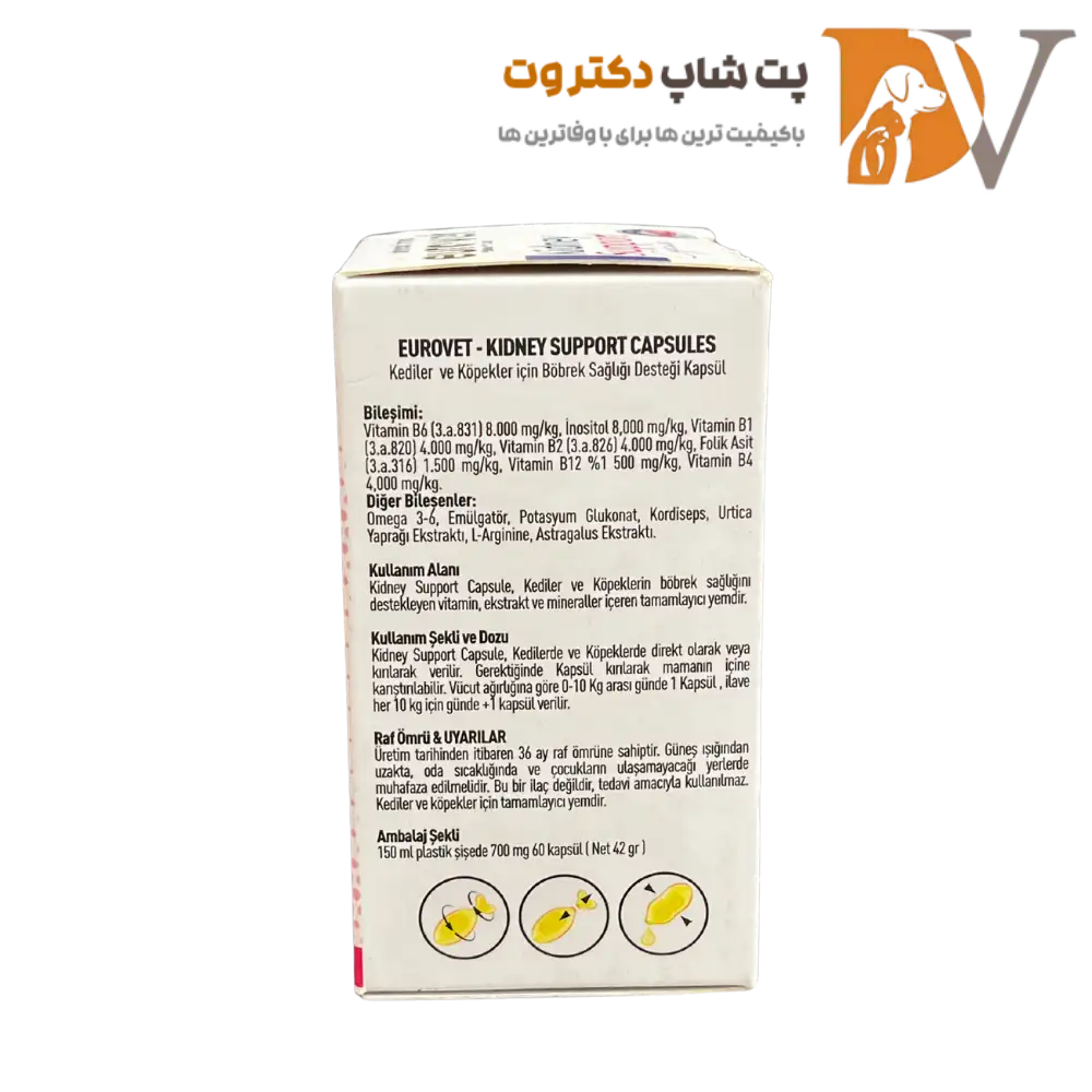 قرص مکمل تقویت کننده کلیه حیوانات یورووت Eurovet Kidney Support بسته ۶۰ عددی، کپسول تخصصی ساخت ترکیه است که با ترکیب ویتامینهای B1، B2، B4، B12، اینوزیتول، اسید فولیک، امگا ۳ و ۶، عصاره گزنه، آستراگالوس و کوردیسپس، عملکرد کلیههای سگ و گربه را حمایت کرده و از آسیب اکسیداتیو، التهاب و نارسایی کلیوی جلوگیری میکند؛ مناسب تمام نژادها برای حفظ تعادل الکترولیتها، بهبود جریان خون کلیوی و تقویت سیستم ایمنی.