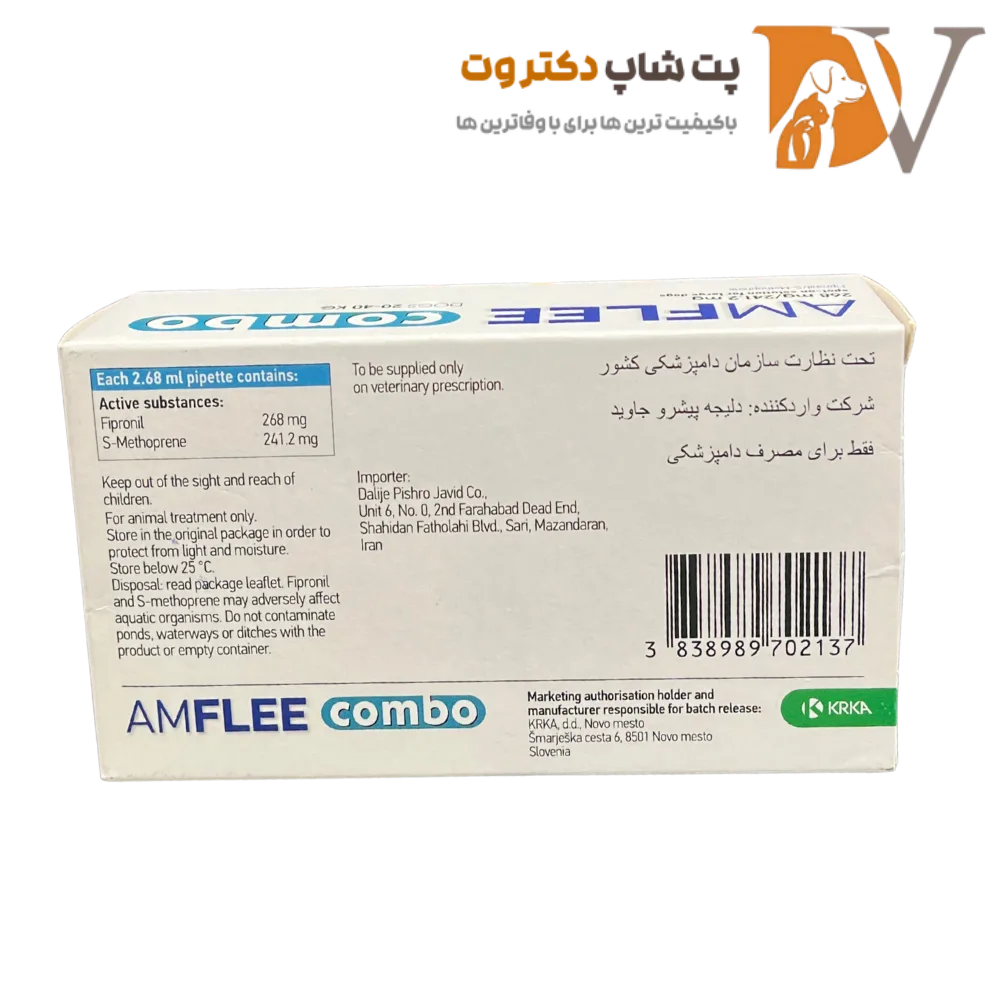 قطره ضد کک و کنه سگ نژاد بزرک آمفلی کومبو Amflee combo، قطره ضد کک و کنه سگ نژاد بزرگ آمفلی کومبو Amflee Combo، محصولی پیشرفته ساخت اسلوونی است که برای سگهای بالای ۴۰ کیلوگرم طراحی شده و با ترکیب ایمیداکلوپراید و پرمترین، کک، کنه، شپش و لاروها را از بین برده و تا ۸ هفته از آلودگی مجدد جلوگیری میکند.