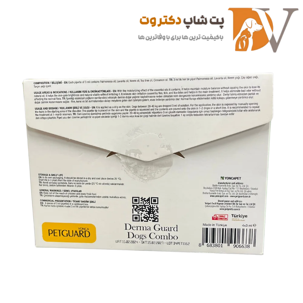 قطره ضد کک و کنه سگ نژاد بزرگ پت گارد PetGuard Derma Guard Dogs Combo بسته ۴ عددی، محصولی تخصصی ساخت ترکیه است که برای سگهای ۲۰ تا ۴۰ کیلوگرم و نژادهای بزرگ طراحی شده و کک، کنه و لاروهای سطح پوست را به طور مؤثر از بین برده و از آلودگی مجدد تا ۱ ماه جلوگیری میکند.