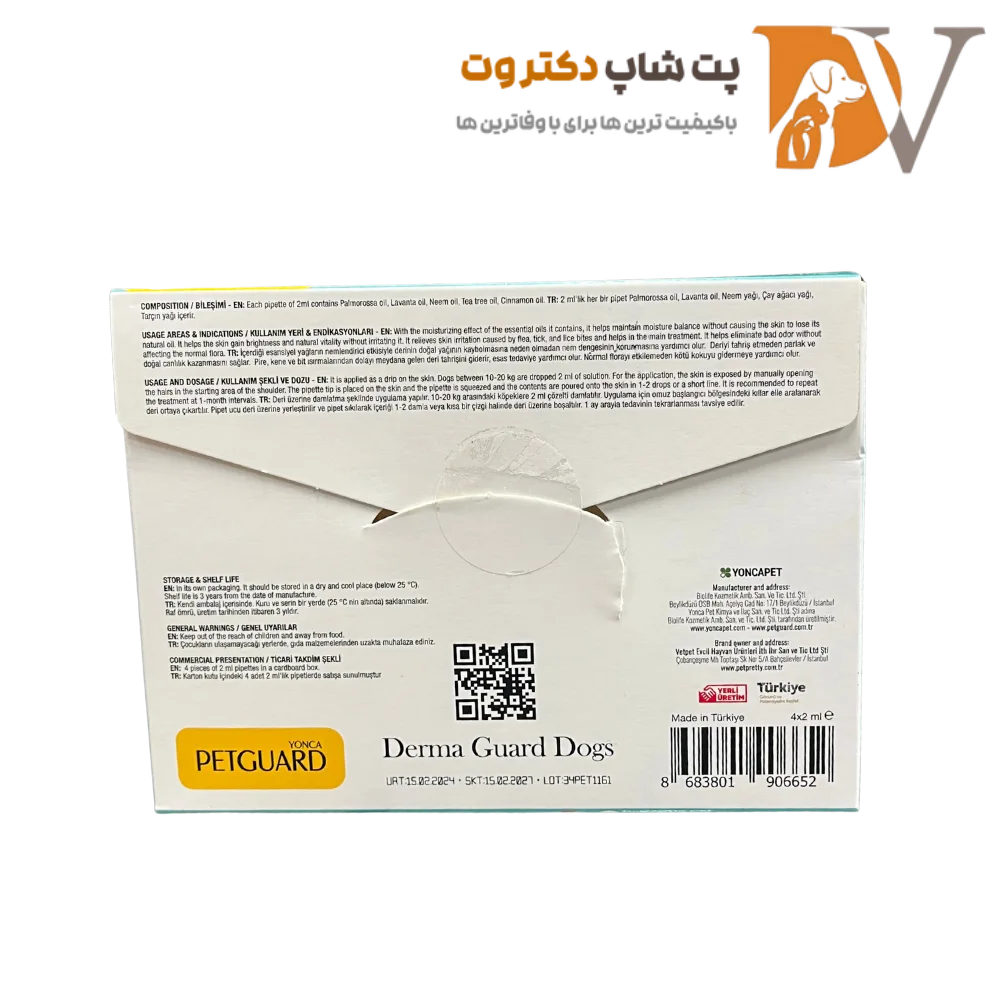 قطره ضد کک و کنه سگ نژاد متوسط پت گارد PetGuard Derma Guard Dogs Combo بسته ۴ عددی،محصولی تخصصی ساخت ترکیه است که برای سگ‌های ۱۰ تا ۲۰ کیلوگرم طراحی شده و کک، کنه و لاروهای سطح پوست را به طور مؤثر از بین برده و از آلودگی مجدد تا ۱ ماه جلوگیری می‌کند.​