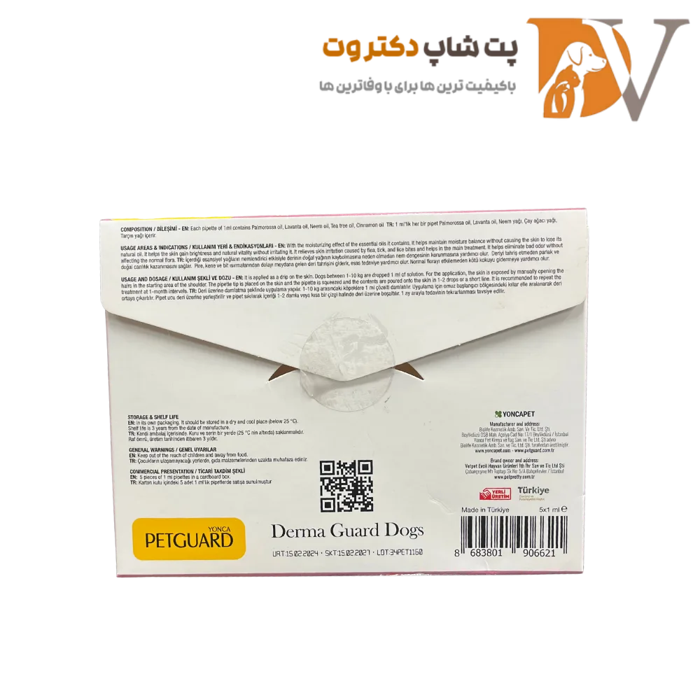 قطره ضد کک و کنه سگ نژاد کوچک پت گارد PetGuard Derma Guard Dogs Combo بسته ۴ عددی، محصولی تخصصی ساخت ترکیه است که برای سگهای ۱ تا ۱۰ کیلوگرم و نژادهای کوچک طراحی شده و کک، کنه و لاروهای سطح پوست را به طور مؤثر از بین برده و از آلودگی مجدد تا ۱ ماه جلوگیری میکند.