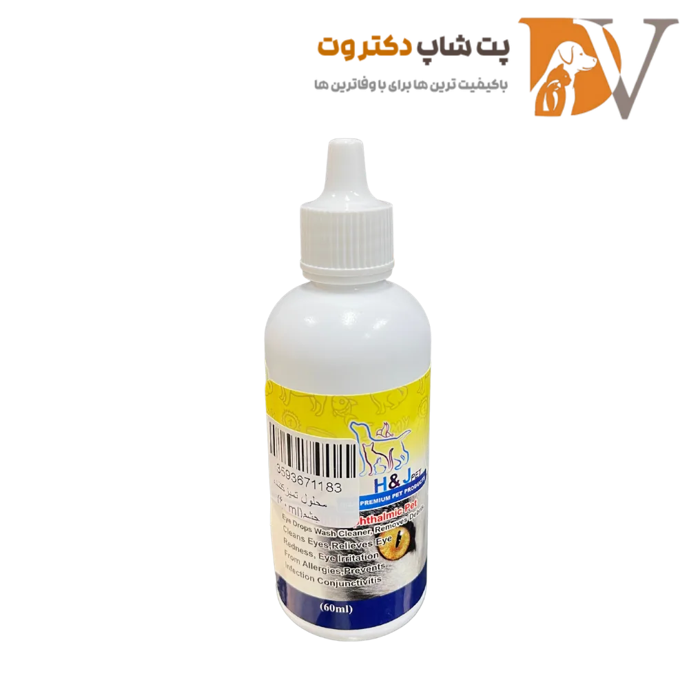 محلول تمیز کننده چشم سگ و گربه اچ اند جی پت مدل Antimicrobial حجم ۶۰ میلی لیتر، محصولی استریل و ضدعفونیکننده ساخت اسپانیا است که ترشحات چشمی را پاک کرده و از بروز عفونتهای چشمی مانند کانژکتیویت جلوگیری میکند.