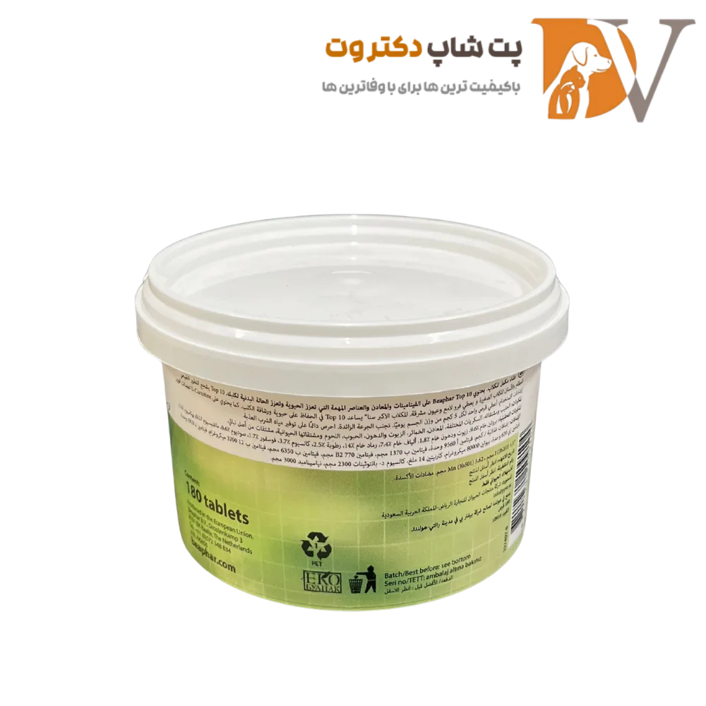 مولتی ویتامین تاپ تن بیفار مخصوص سگ ۱۸۰ عددی، مکمل غذایی تخصصی ساخت هلند است که با ترکیب ۱۰ ویتامین ضروری (A، D3، E، B1، B2، B6، B12)، اسید پانتوتنیک، نیکوتینامید، بیوتین، ال-کارنیتین و مواد معدنی/عناصر کمیاب، قوای جسمانی، شادابی، رشد استخوان/دندان و سیستم ایمنی توله تا سگ‌های مسن تمام نژادها را تقویت می‌کند؛ طعم میگو خوش‌خوراک برای پذیرش آسان.​