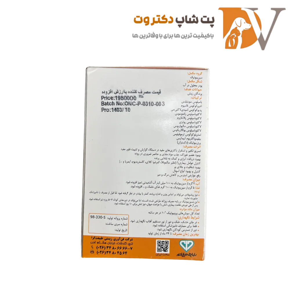 - پروبیوتیک سینبیوتیک با ۹ سویه باکتری و مخمر فعال.