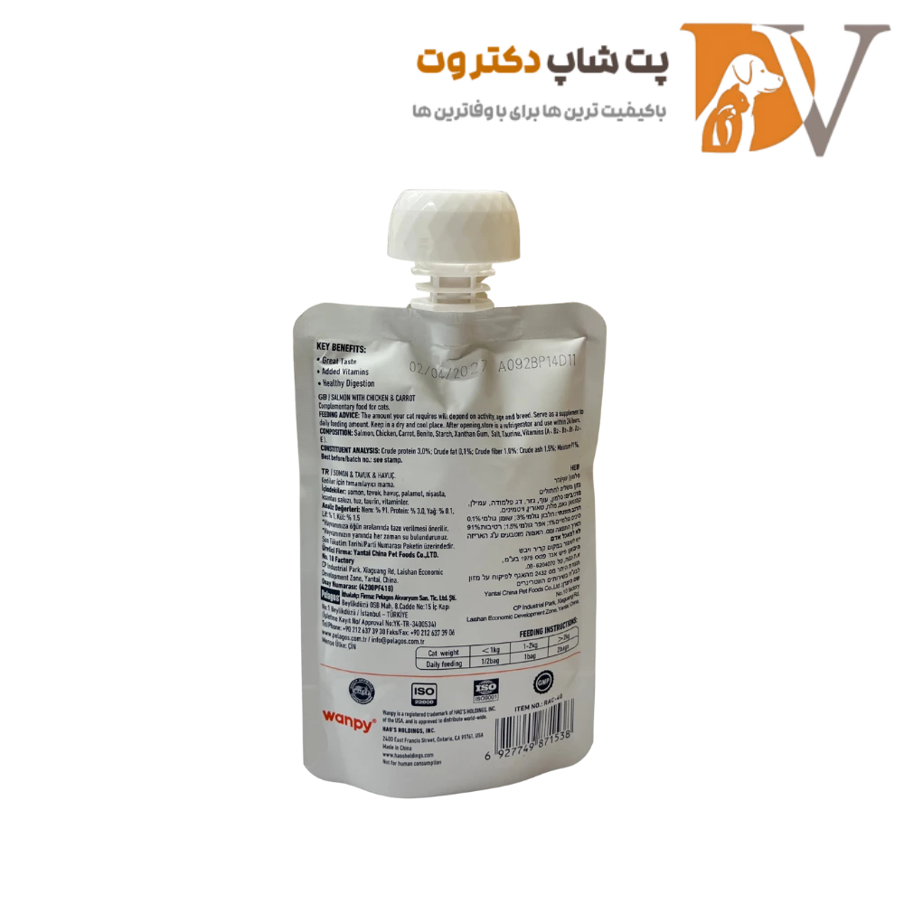 پودینگ گربه ونپی با طعم ماهی سالمون، مرغ و هویج Wanpy Soup Salmon, Chicken & Carrot وزن ۹۰ گرم، نرم و مغذی است که برای تمامی نژادها و سنین گربهها از جمله بچهگربهها بالای ۲ ماه مناسب میباشد. این محصول غنی از پروتئینهای حیوانی ویتامینهای A، B2، B3، B5، D3 و E بوده و حاوی تائورین است که به تقویت بینایی، سیستم قلبی-عروقی و سیستم ایمنی گربه کمک میکند. همچنین این پودینگ فاقد نگهدارنده و طعمدهندههای مصنوعی بوده و با بافت نرم و طعم دلپذیر، برای گربههای بدغذا بسیار مناسب است. بعد از باز شدن بسته باید در یخچال نگهداری و ظرف ۲۴ ساعت مصرف شود.