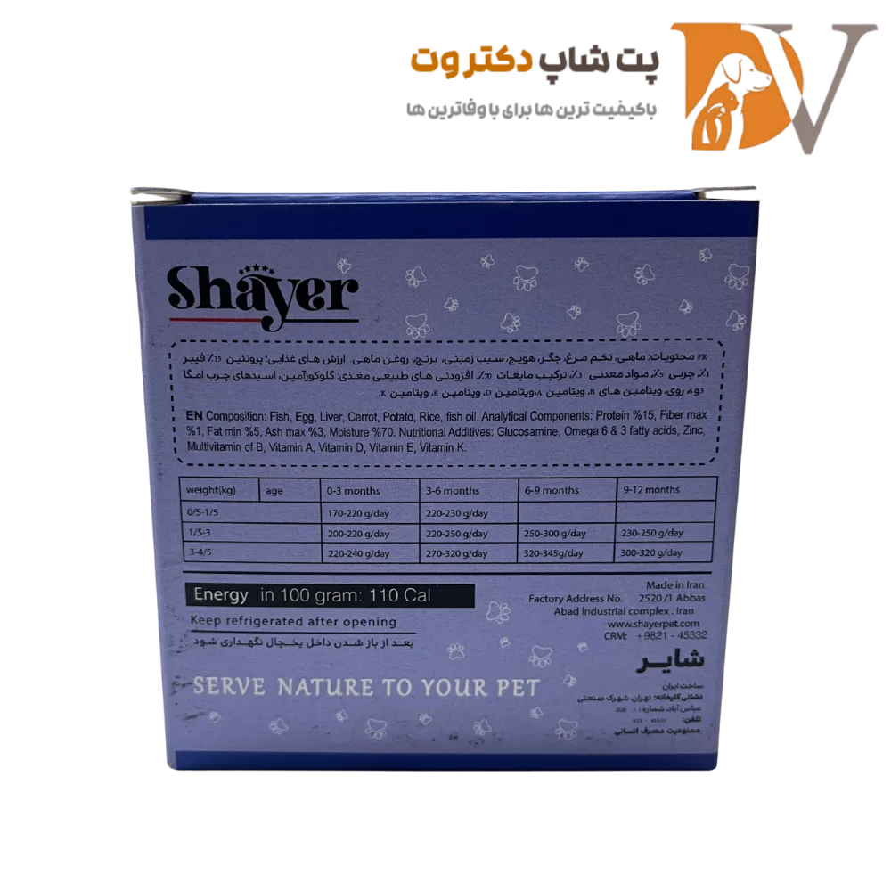 کنسرو بچه گربه با طعم ماهی برند شایر ۹۰ گرمی Shayer fish kitten، یک غذای مرطوب پریمیوم و کامل مناسب برای تمامی نژادها و سنین تا ۱۲ ماهگی است. این کنسرو از تازهترین مواد اولیه و ماهی تهیه شده و دارای بافت پته نرم و یکنواخت است که هضم بسیار آسانی برای بچهگربهها دارد.