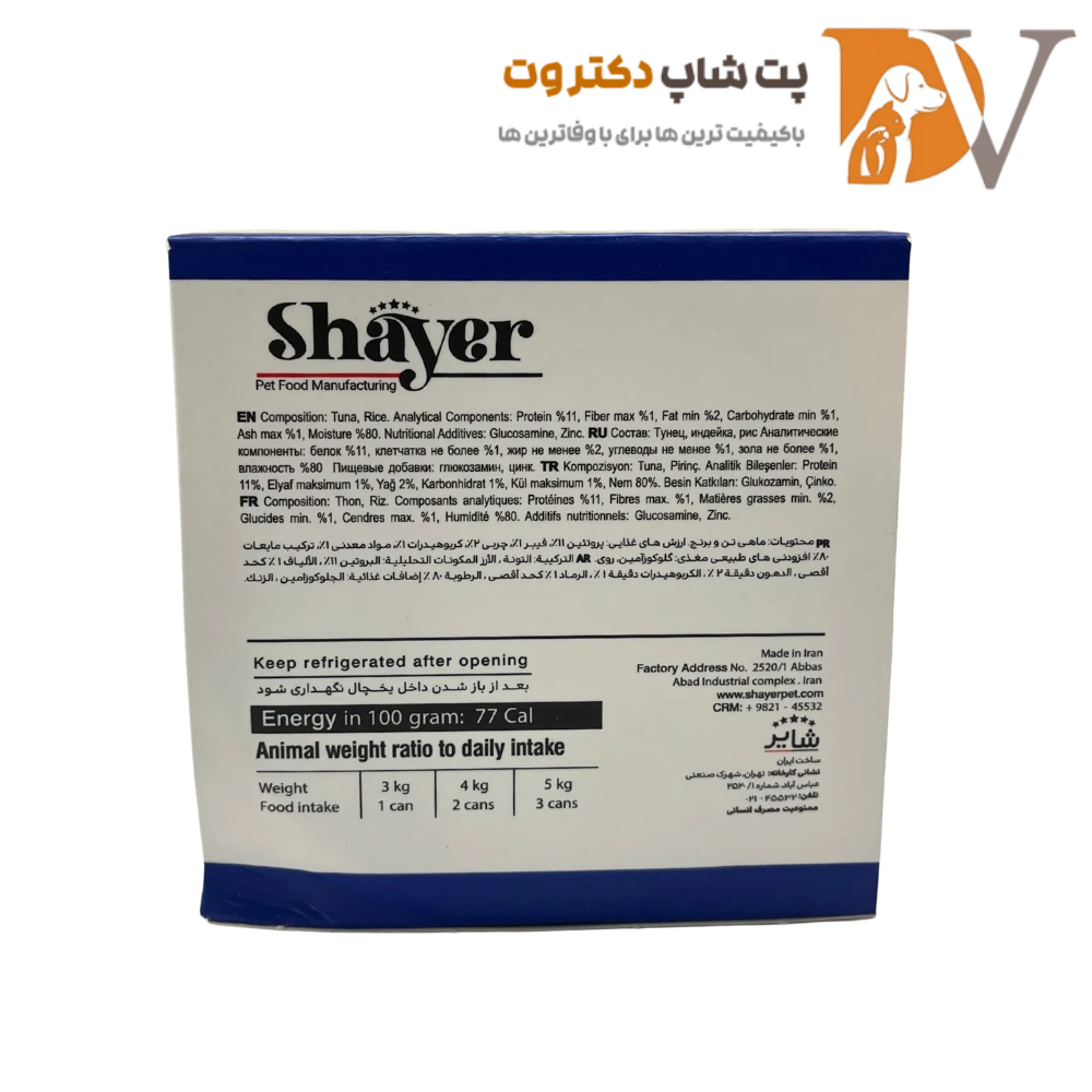 کنسرو گربه با طعم ماهی تن برند شایر ۱۱۰ گرمی، یک غذای نچرال و ارگانیک است که با تکههای خالص و طبیعی ماهی تن به همراه مقدار کمی برنج تهیه میشود. این کنسرو فاقد شکر، نمک، گلوتن و افزودنیهای شیمیایی و محافظ است و میزان چربی پایینی دارد. مقدار پروتئین کامل و وجود فیبر، مواد معدنی (سلنیوم، پتاسیم، کلسیم، گلوکوزامین و روی)، آنتیاکسیدان و ویتامین D، B، A، E رشد سالم، استحکام استخوان، تقویت سیستم ایمنی و سلامت پوست و مو را برای بچه گربهها فراهم میکند. هضم این کنسرو آسان است و به دلیل فرمول کاملاً طبیعی و دارا بودن امگا ۳ و ۶ برای بچه گربههای حساس و بدغذا کاملاً مناسب است.