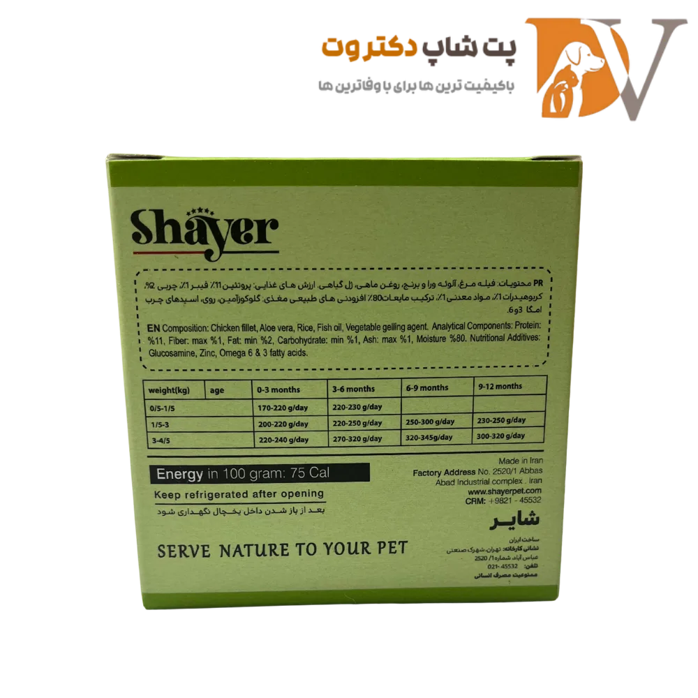 کنسرو بچه گربه با طعم مرغ و آلوئه ورا برند شایر ۹۰ گرمی Shayer Chicken&Aloe vera kitten، یک غذای مرطوب و پریمیوم مخصوص بچهگربههای تا سن ۱۲ ماهگی و وزن حدود ۴.۵ کیلوگرم است. این کنسرو شامل فیله مرغ تازه و طبیعی و تکههای آلوئهورا در ژله، ویتامینهای ضروری K، E، D، A، B، روغن ماهی، تائورین، آنتیاکسیدانها، گلوکوزامین، روی، امگا ۳ و امگا ۶ میباشد. محصول فاقد شکر و افزودنی شیمیایی بوده و بافت نرم و قابل هضم آن به بهبود عملکرد دستگاه گوارش، سلامت پوست و موی بچهگربه، رشد مناسب و تقویت سیستم ایمنی کمک میکند. آلوئهورا در این کنسرو خاصیت ضدالتهابی دارد و به سلامت رودهها و جذب املاح ضروری کمک مینماید.