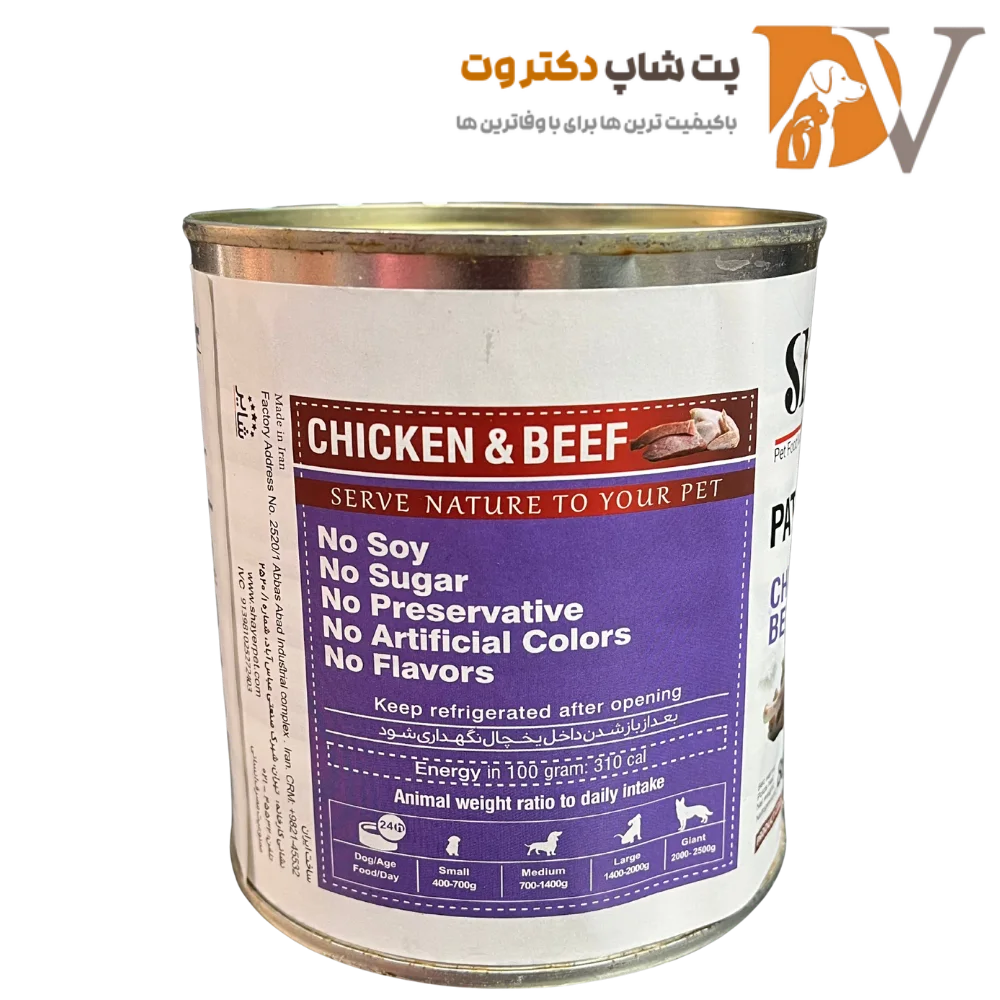 کنسرو پته سگ با طعم مرغ و گوشت برند شایر Shayer Pate With Chicken & Beef وزن 800 گرم