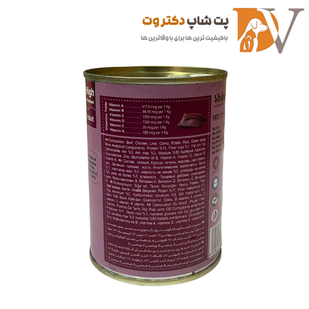 کنسرو پته گربه با طعم گوشت برند شایر Shayer Pate With Beef وزن ۴۰۰ گرم، یک غذای مرطوب و مقوی برای گربههای بالغ است که از گوشت تازه گاو و جگر به همراه برنج، هویج، نخود سبز، کلم و استخوان تهیه شده است. این فرمول غنی حاوی پروتئین بالا، اسیدهای چرب امگا ۳ و ۶، فیبر، گلوکوزامین و زینک بوده، فاقد افزودنیهای شیمیایی، رنگهای مصنوعی، پرکنندهها، شکر، نمک و گلوتن است. وجود ویتامینهای گروه B، A، D، E و K به تقویت قلب، دستگاه عصبی مرکزی، سلامت کبد، پوست، مو و مفاصل کمک میکند.