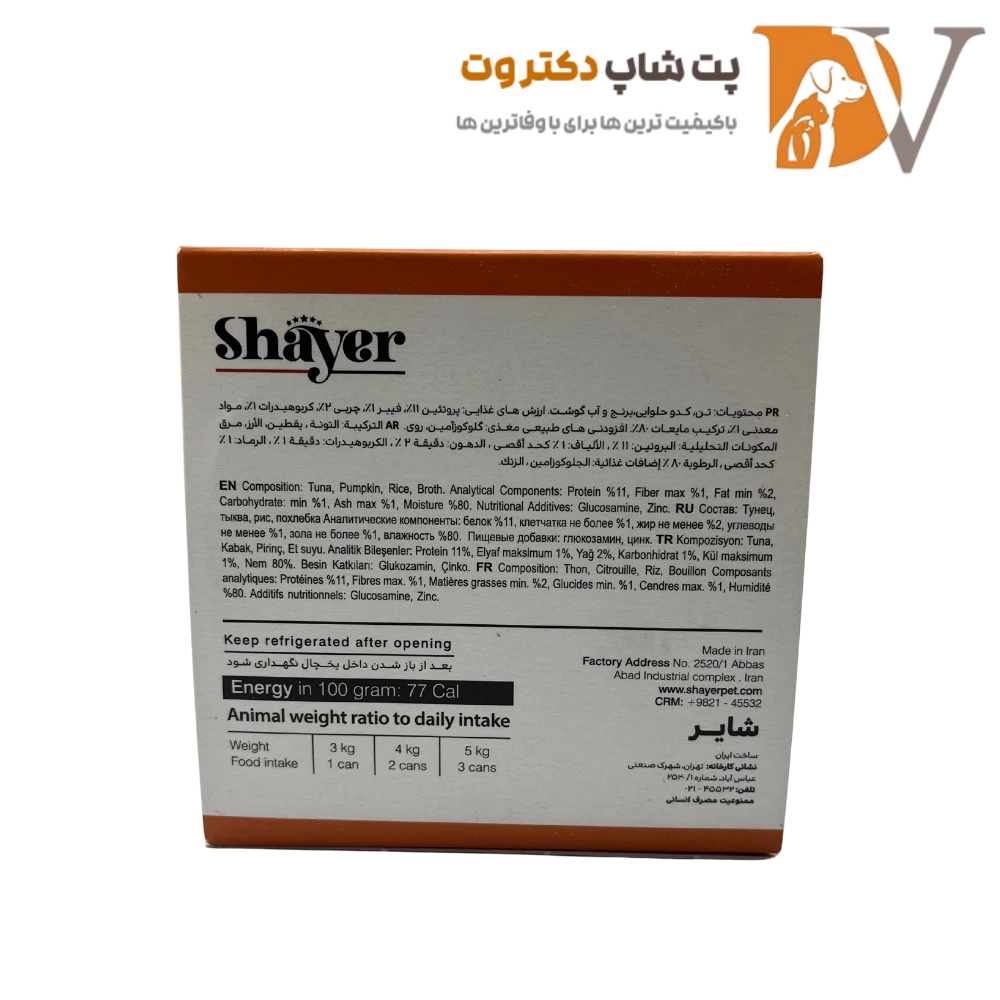 کنسرو گربه با طعم ماهی تن و کدو برند شایر ۱۱۰ گرمی،  یک غذای مرطوب نچرال و کاملاً طبیعی است که برای گربه‌های بالغ مناسب بوده و محتوی گوشت مرغ و بوقلمون به صورت پته‌ی یکدست شده می‌باشد. این خوراک سرشار از پروتئین، فیبر، ویتامین‌ها و مواد معدنی ضروری مانند فسفر، گلوکوزامین و زینک است که به حفظ سلامت استخوان، پوست، مو و تقویت سیستم ایمنی کمک می‌کند. فاقد افزودنی‌های شیمیایی، شکر، نمک، گلوتن و فیلر است. این کنسرو با بافت نرم و طعم دلپذیر، هضم آسانی دارد و مناسب گربه‌های بدغذا و حساس است.